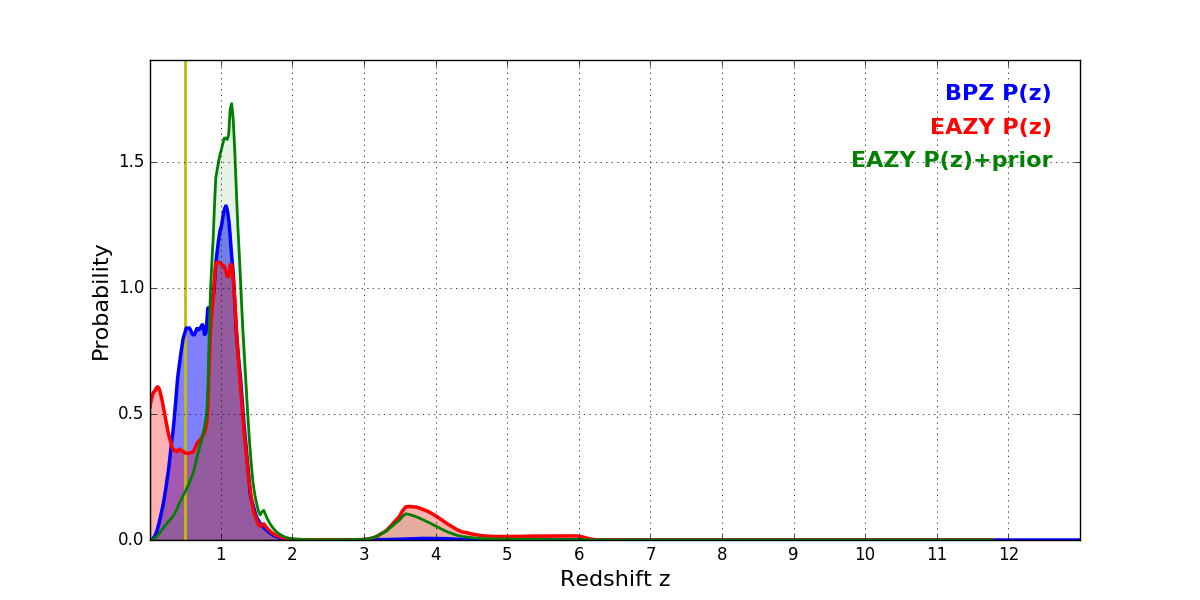 In P(z) plots: Yellow lines mark the cluster redshift z = 0.505,