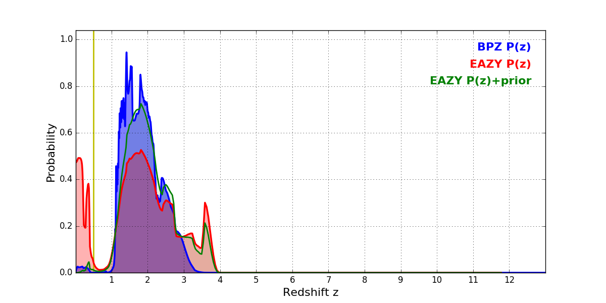 In P(z) plots: Yellow lines mark the cluster redshift z = 0.505,
