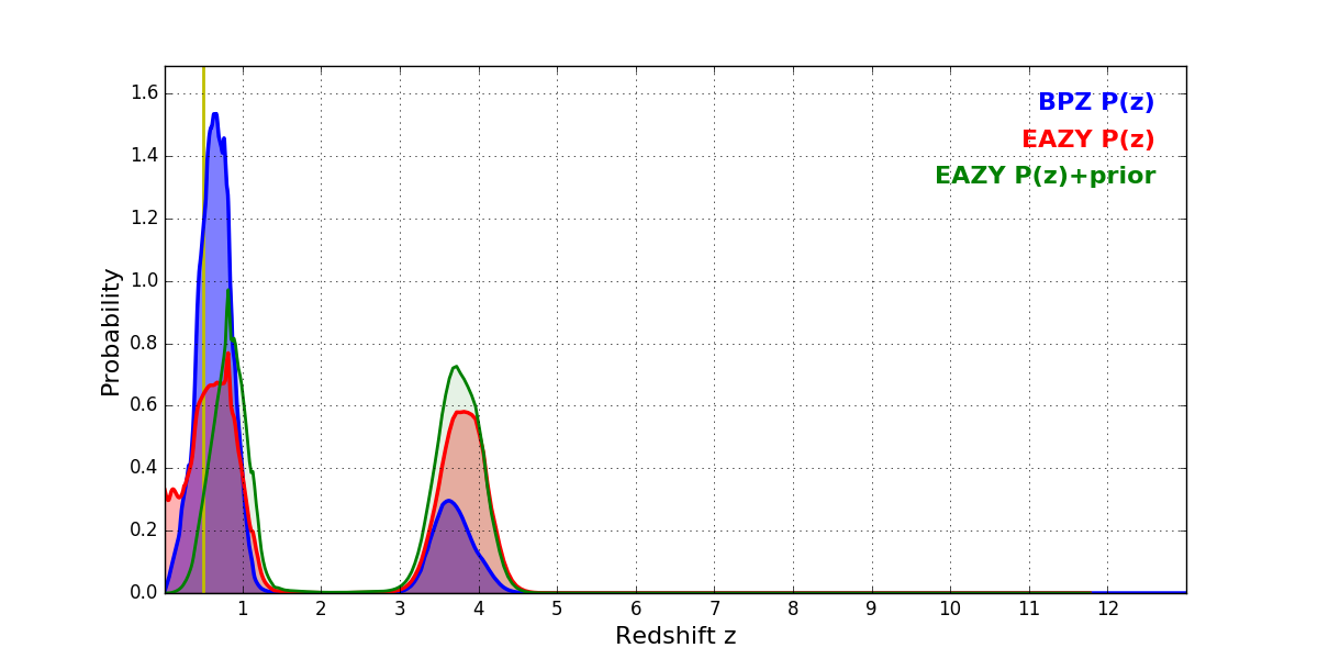 In P(z) plots: Yellow lines mark the cluster redshift z = 0.505,