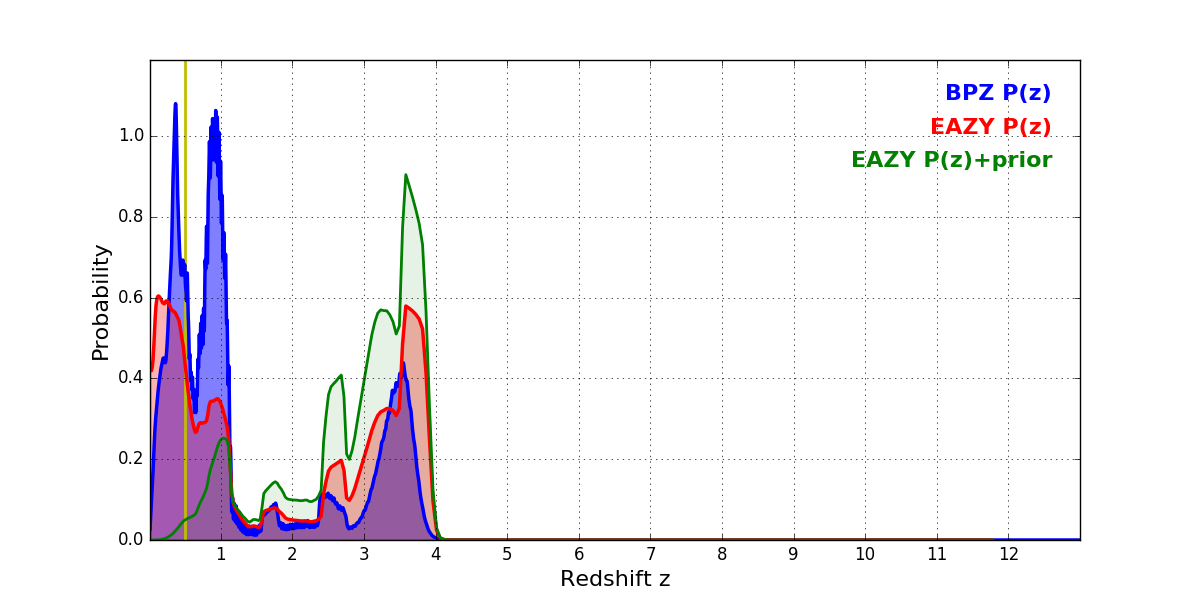 In P(z) plots: Yellow lines mark the cluster redshift z = 0.505,
