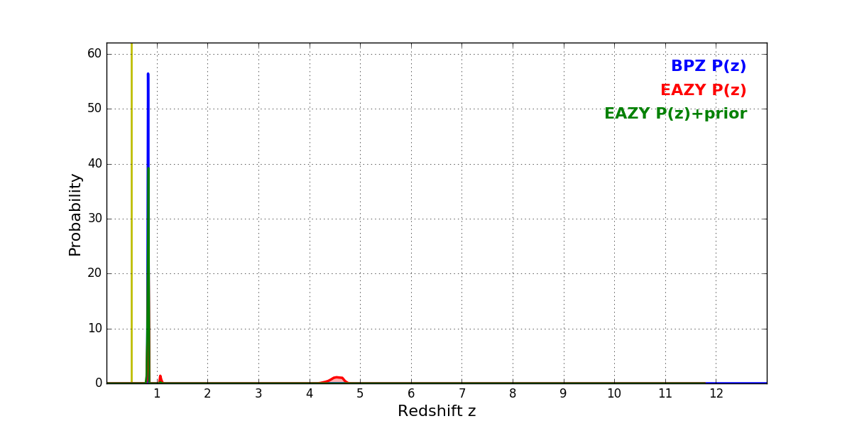 In P(z) plots: Yellow lines mark the cluster redshift z = 0.505,