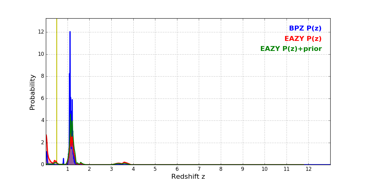 In P(z) plots: Yellow lines mark the cluster redshift z = 0.505,