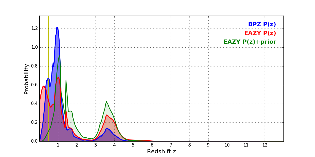 In P(z) plots: Yellow lines mark the cluster redshift z = 0.505,