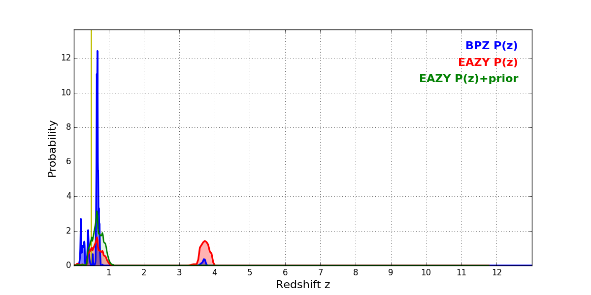 In P(z) plots: Yellow lines mark the cluster redshift z = 0.505,
