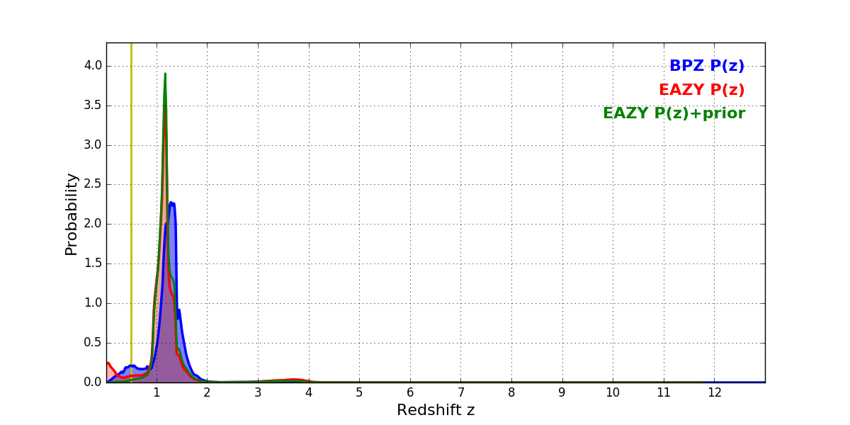 In P(z) plots: Yellow lines mark the cluster redshift z = 0.505,