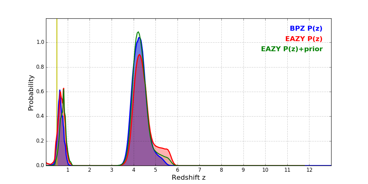 In P(z) plots: Yellow lines mark the cluster redshift z = 0.505,
