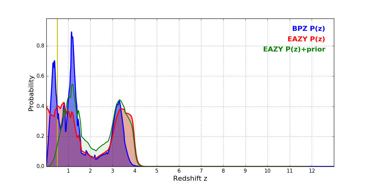 In P(z) plots: Yellow lines mark the cluster redshift z = 0.505,