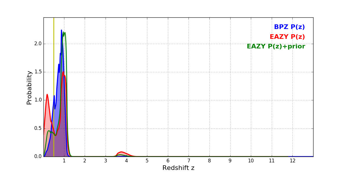 In P(z) plots: Yellow lines mark the cluster redshift z = 0.505,