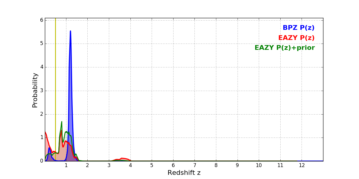 In P(z) plots: Yellow lines mark the cluster redshift z = 0.505,