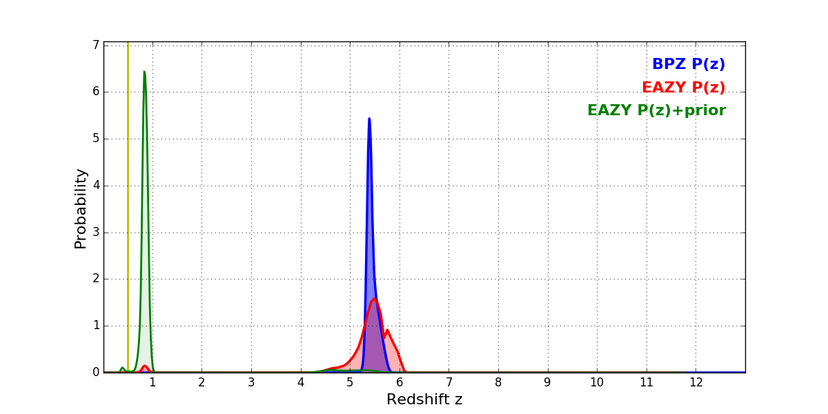 In P(z) plots: Yellow lines mark the cluster redshift z = 0.505,
