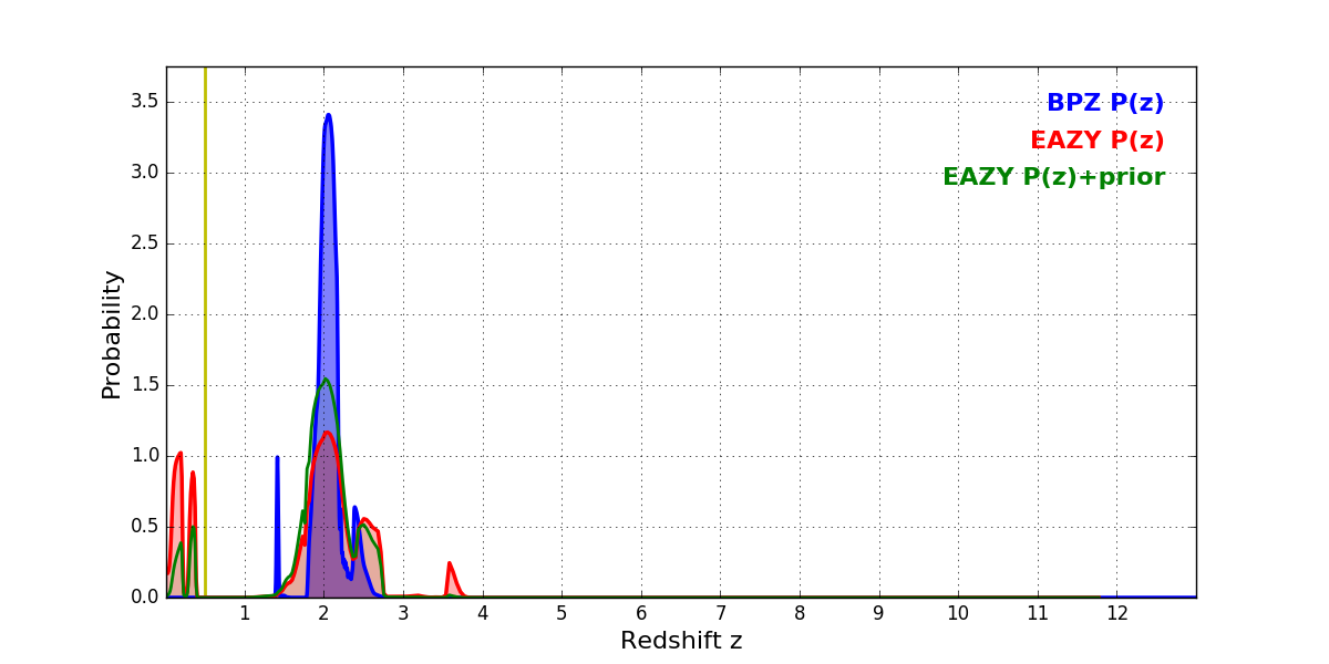 In P(z) plots: Yellow lines mark the cluster redshift z = 0.505,