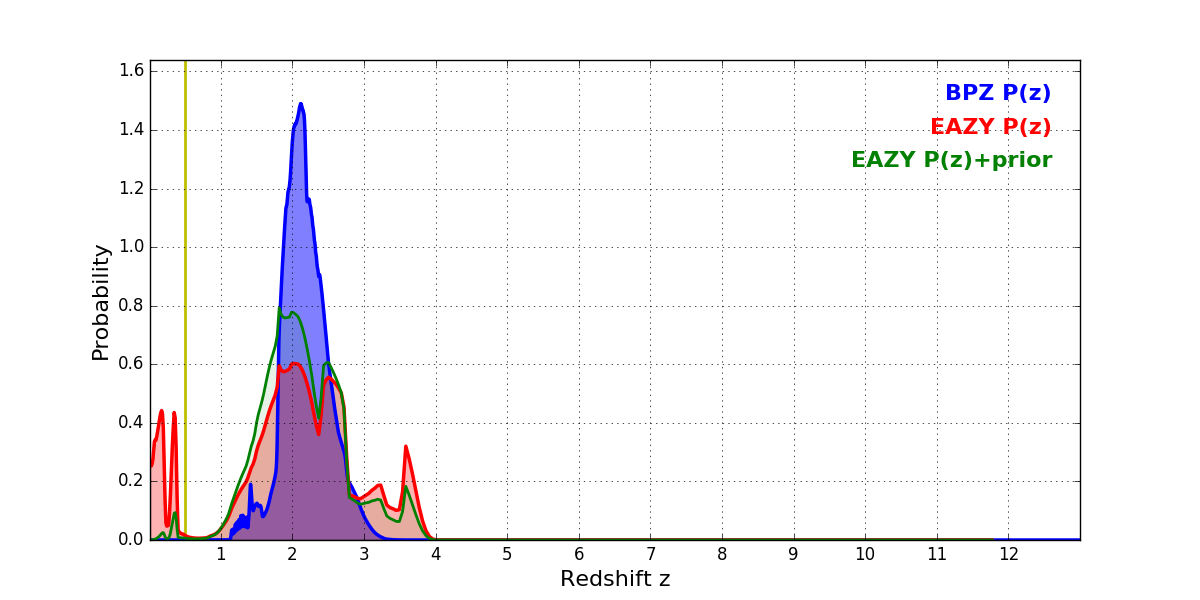 In P(z) plots: Yellow lines mark the cluster redshift z = 0.505,