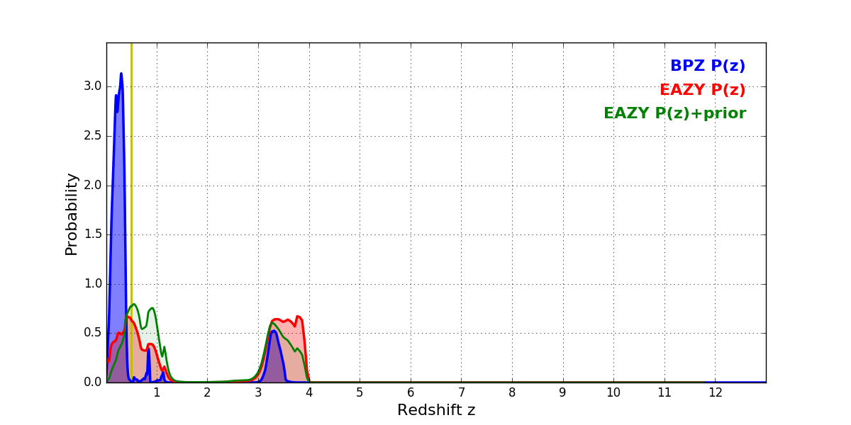 In P(z) plots: Yellow lines mark the cluster redshift z = 0.505,