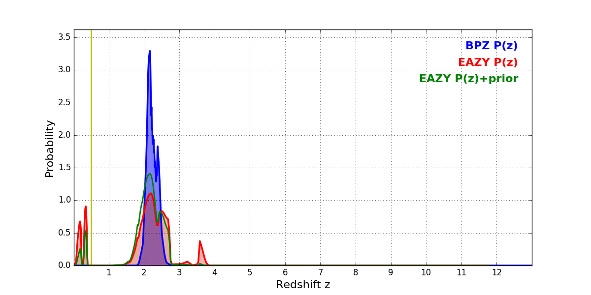 In P(z) plots: Yellow lines mark the cluster redshift z = 0.505,
