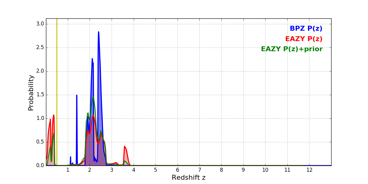 In P(z) plots: Yellow lines mark the cluster redshift z = 0.505,