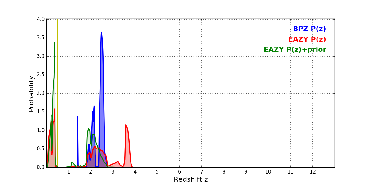 In P(z) plots: Yellow lines mark the cluster redshift z = 0.505,