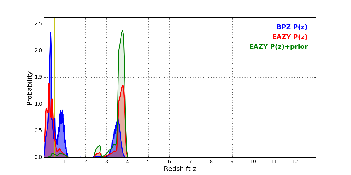 In P(z) plots: Yellow lines mark the cluster redshift z = 0.505,