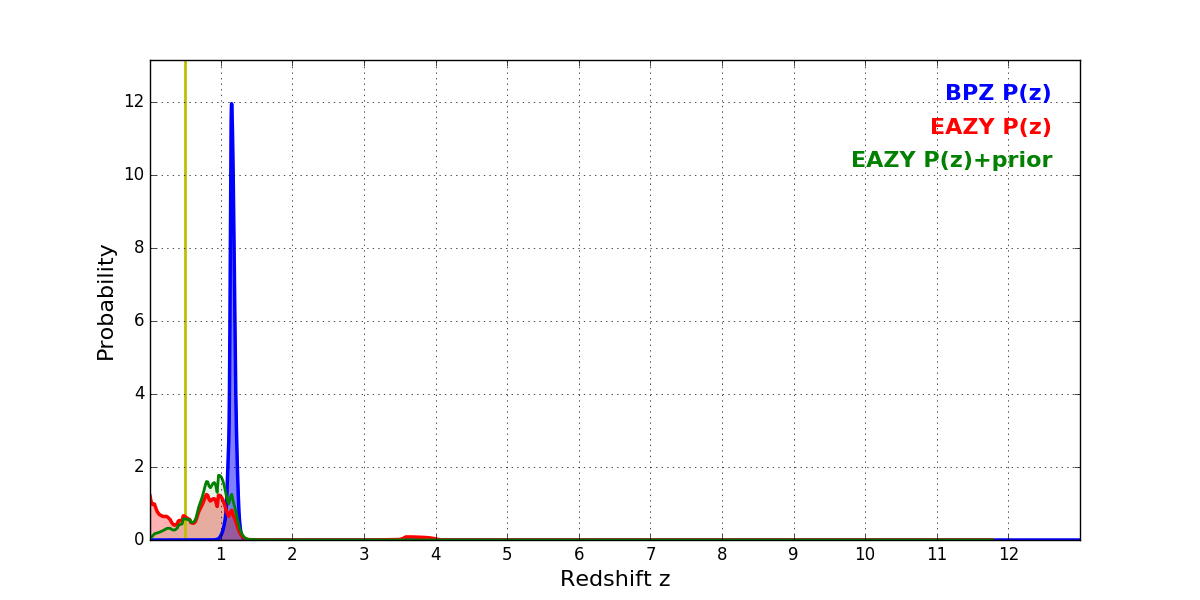 In P(z) plots: Yellow lines mark the cluster redshift z = 0.505,