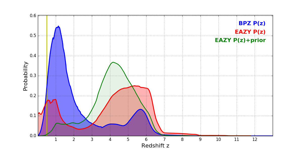 In P(z) plots: Yellow lines mark the cluster redshift z = 0.505,