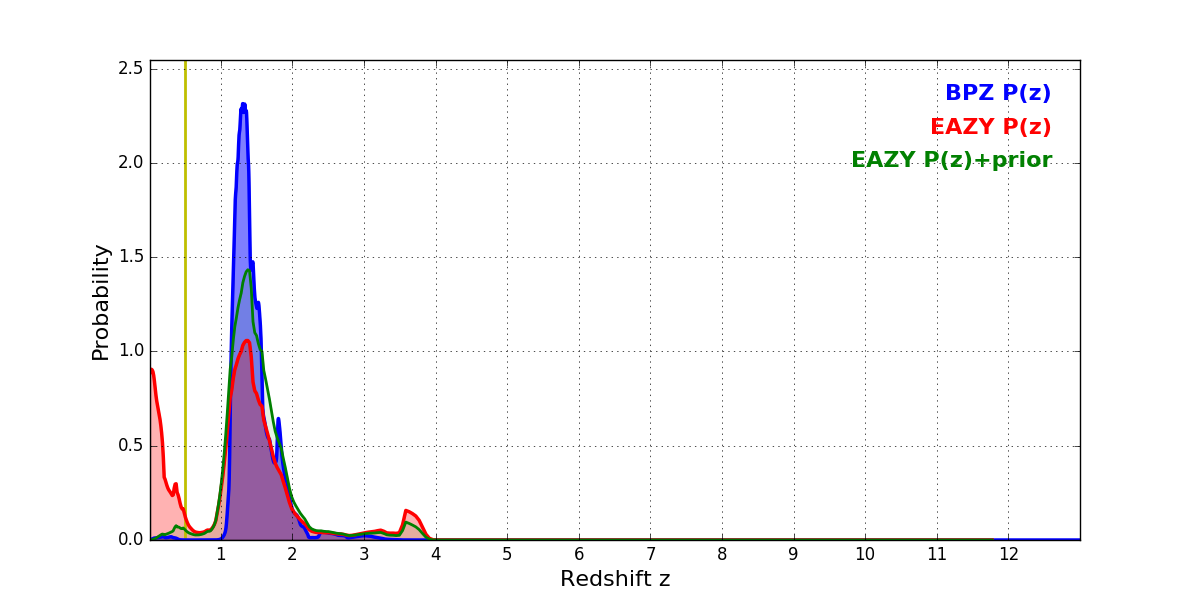 In P(z) plots: Yellow lines mark the cluster redshift z = 0.505,
