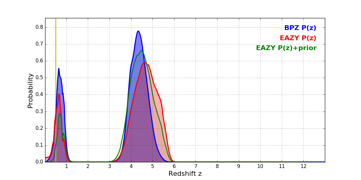 In P(z) plots: Yellow lines mark the cluster redshift z = 0.505,