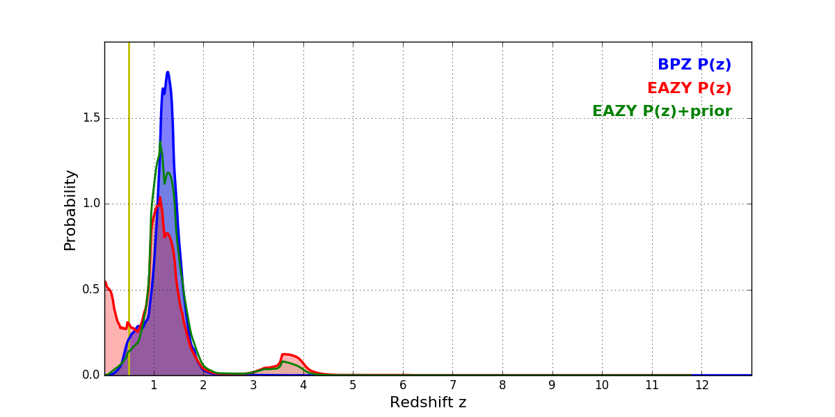 In P(z) plots: Yellow lines mark the cluster redshift z = 0.505,