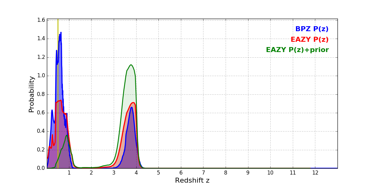 In P(z) plots: Yellow lines mark the cluster redshift z = 0.505,