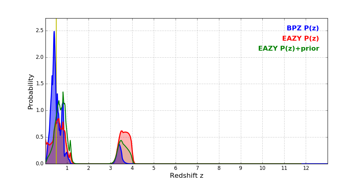 In P(z) plots: Yellow lines mark the cluster redshift z = 0.505,