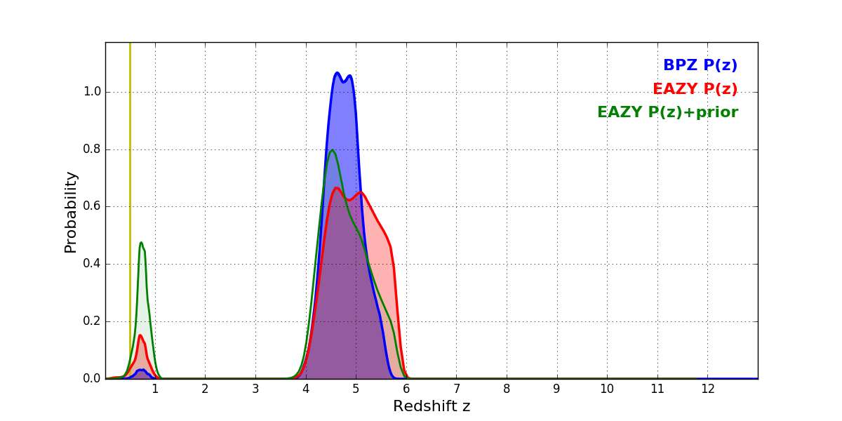 In P(z) plots: Yellow lines mark the cluster redshift z = 0.505,