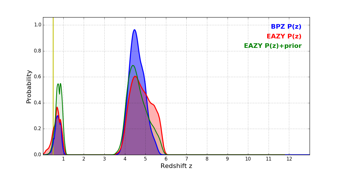 In P(z) plots: Yellow lines mark the cluster redshift z = 0.505,
