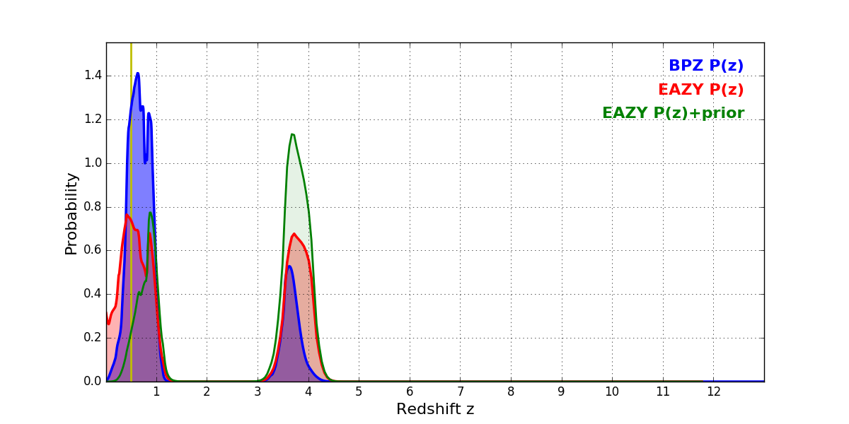 In P(z) plots: Yellow lines mark the cluster redshift z = 0.505,