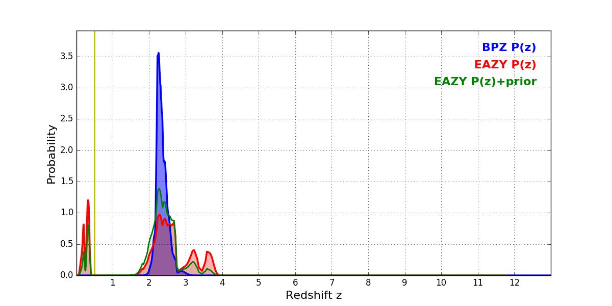 In P(z) plots: Yellow lines mark the cluster redshift z = 0.505,