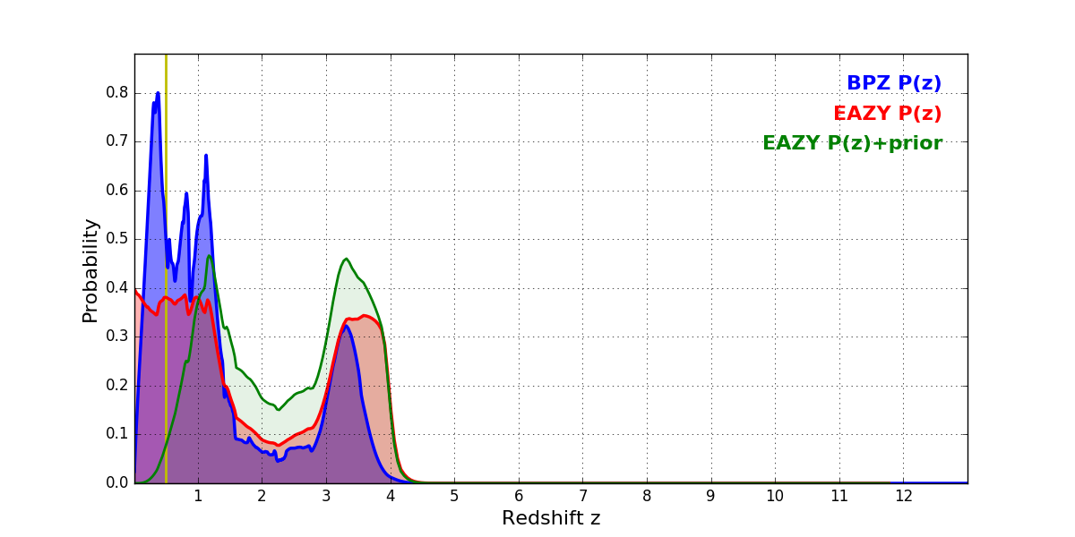 In P(z) plots: Yellow lines mark the cluster redshift z = 0.505,