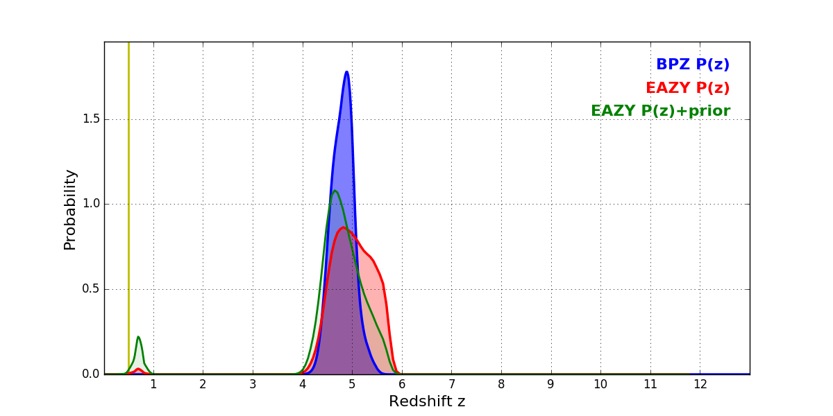 In P(z) plots: Yellow lines mark the cluster redshift z = 0.505,