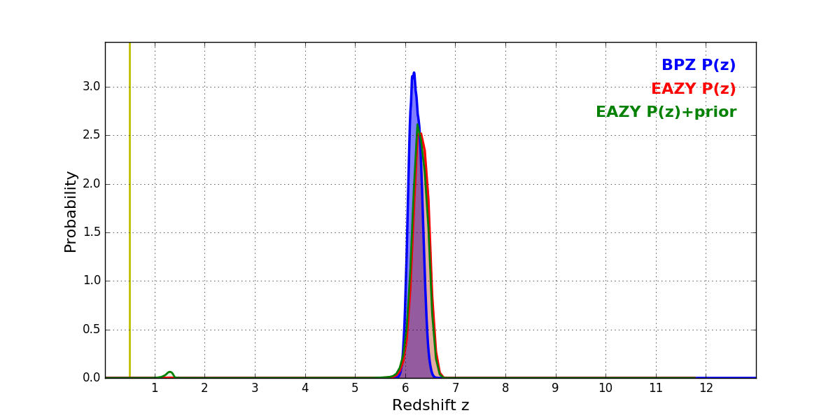 In P(z) plots: Yellow lines mark the cluster redshift z = 0.505,