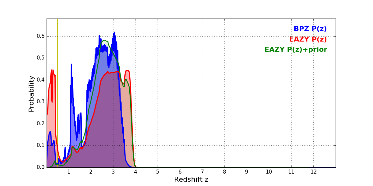 In P(z) plots: Yellow lines mark the cluster redshift z = 0.505,
