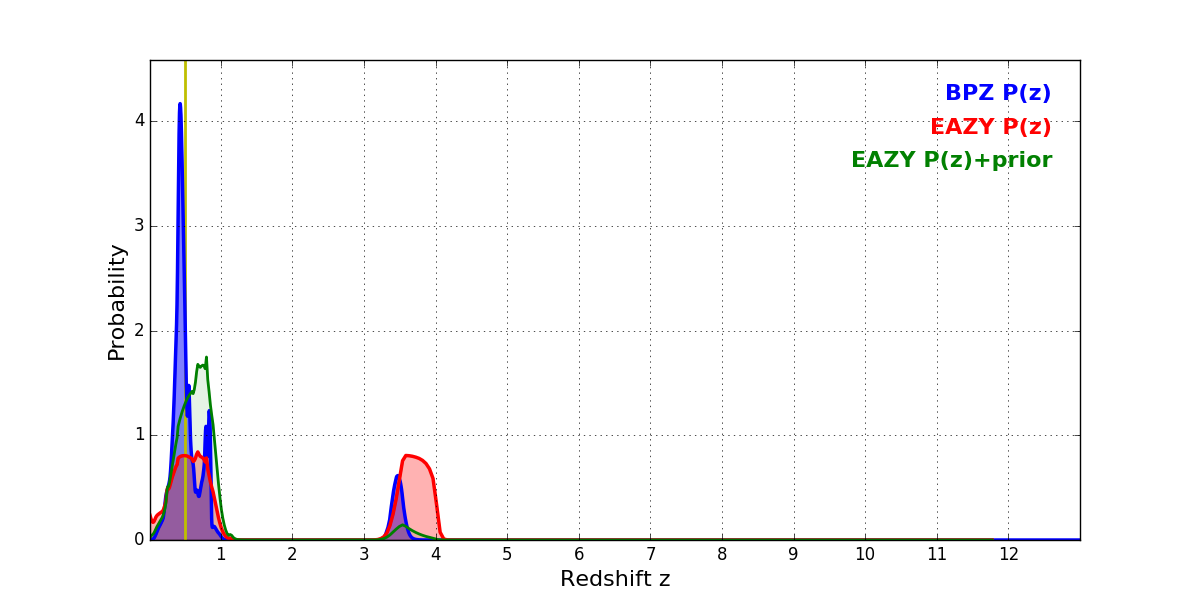 In P(z) plots: Yellow lines mark the cluster redshift z = 0.505,