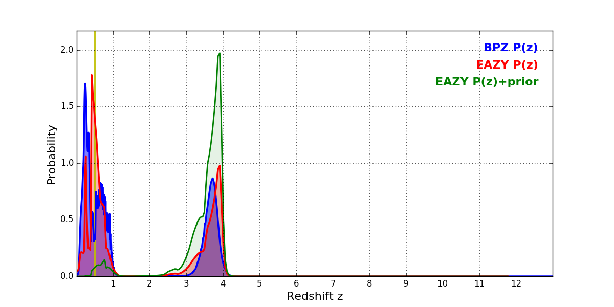 In P(z) plots: Yellow lines mark the cluster redshift z = 0.505,