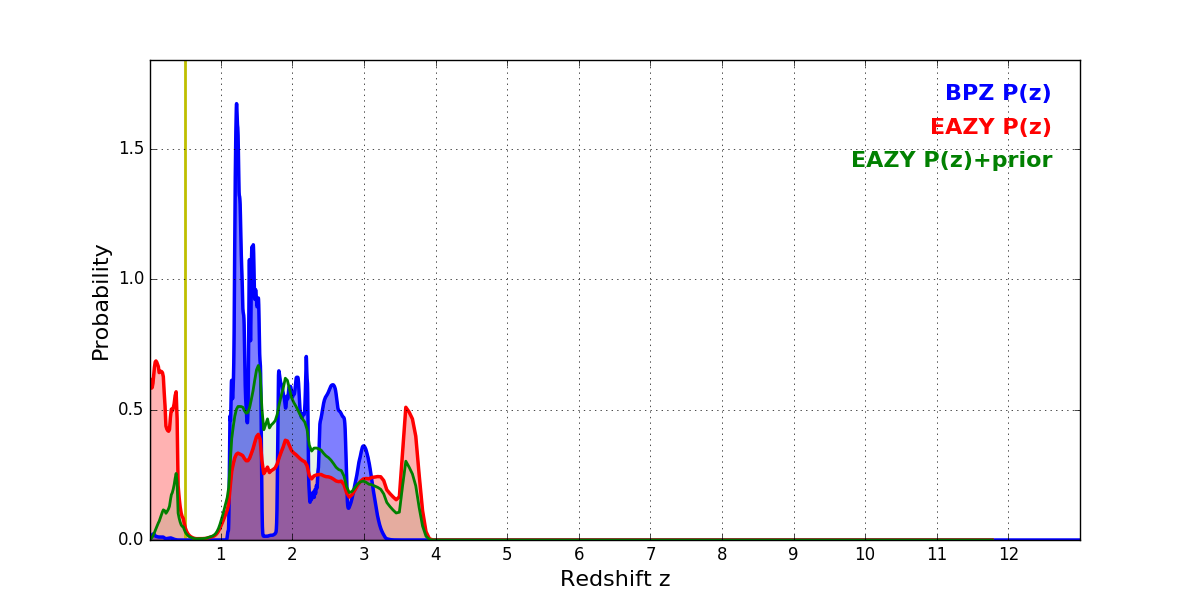 In P(z) plots: Yellow lines mark the cluster redshift z = 0.505,