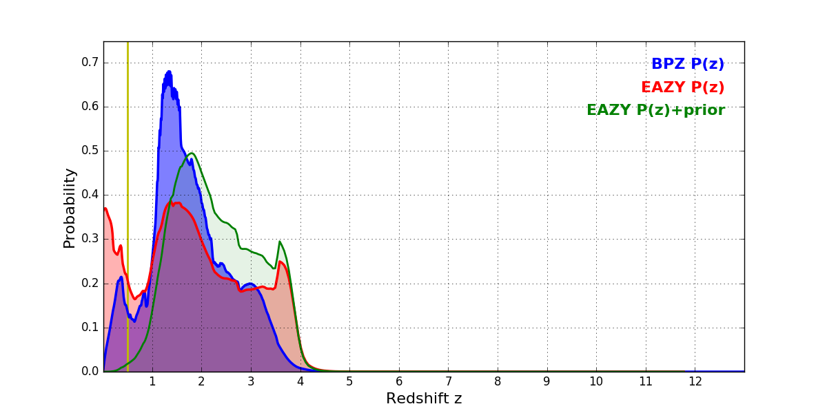 In P(z) plots: Yellow lines mark the cluster redshift z = 0.505,