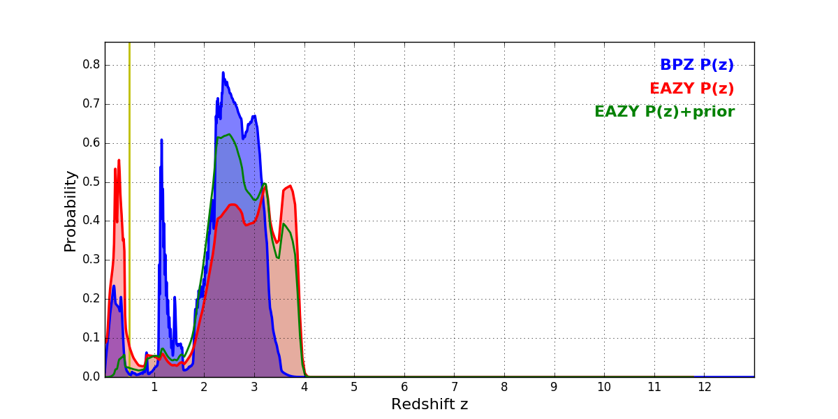 In P(z) plots: Yellow lines mark the cluster redshift z = 0.505,