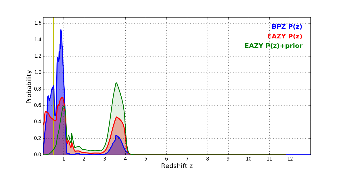 In P(z) plots: Yellow lines mark the cluster redshift z = 0.505,