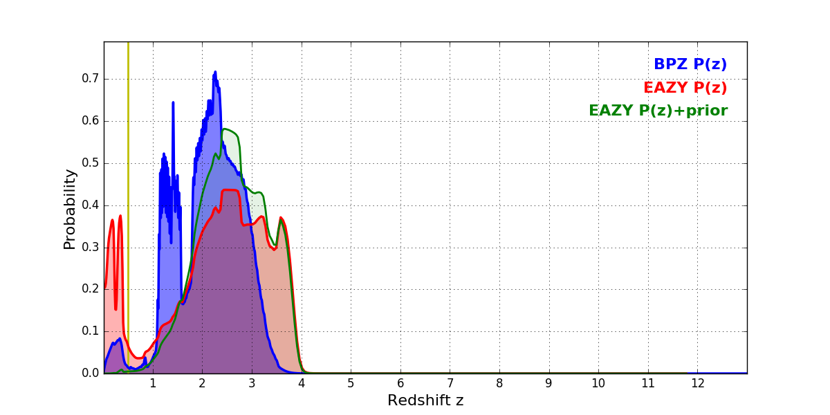 In P(z) plots: Yellow lines mark the cluster redshift z = 0.505,