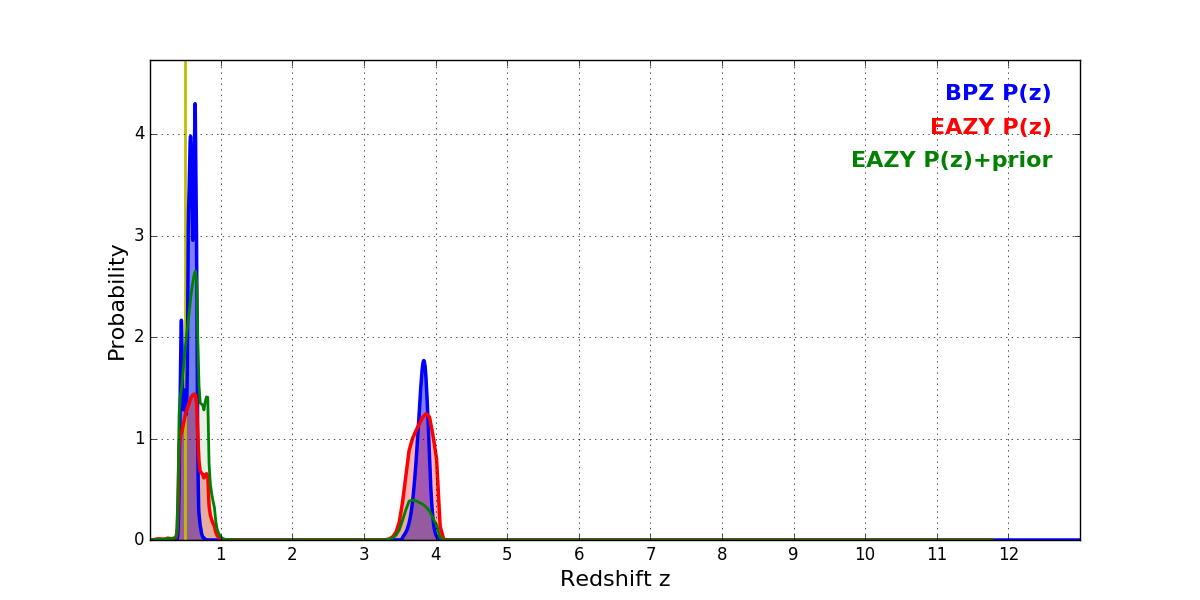 In P(z) plots: Yellow lines mark the cluster redshift z = 0.505,