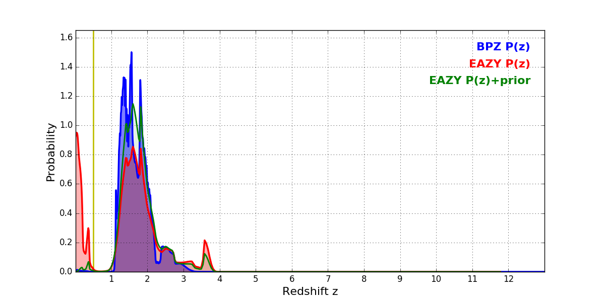 In P(z) plots: Yellow lines mark the cluster redshift z = 0.505,