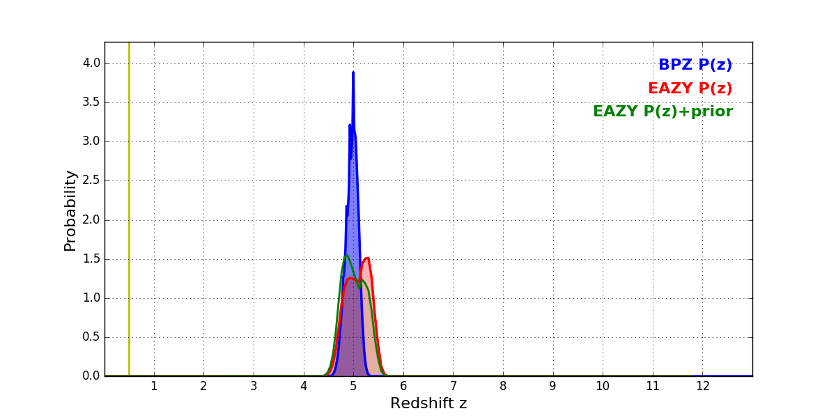 In P(z) plots: Yellow lines mark the cluster redshift z = 0.505,