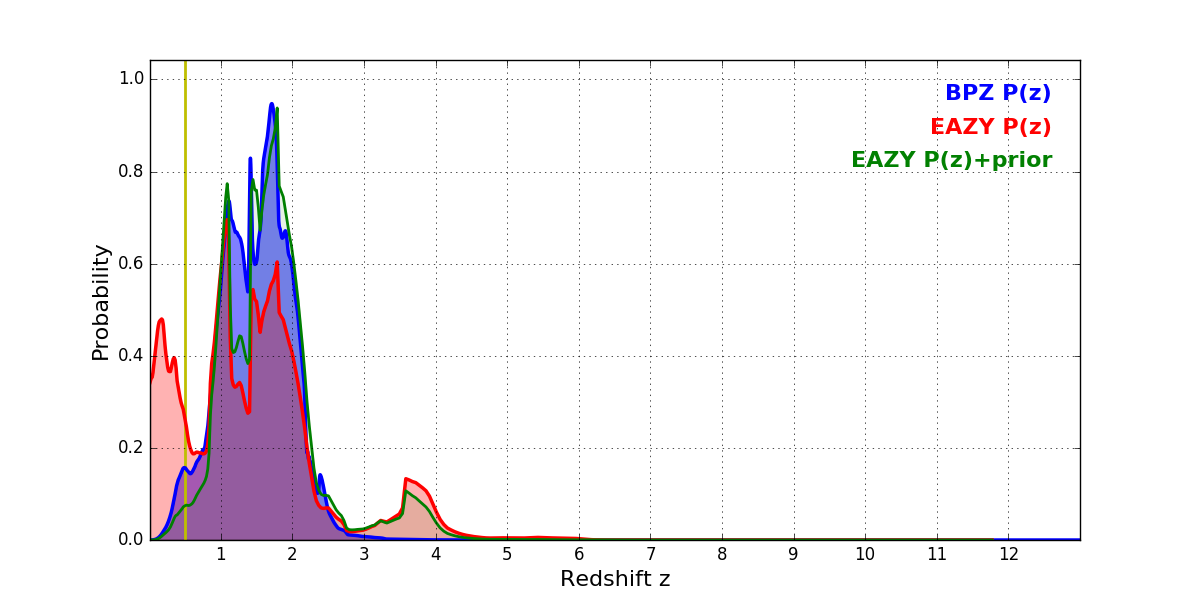 In P(z) plots: Yellow lines mark the cluster redshift z = 0.505,