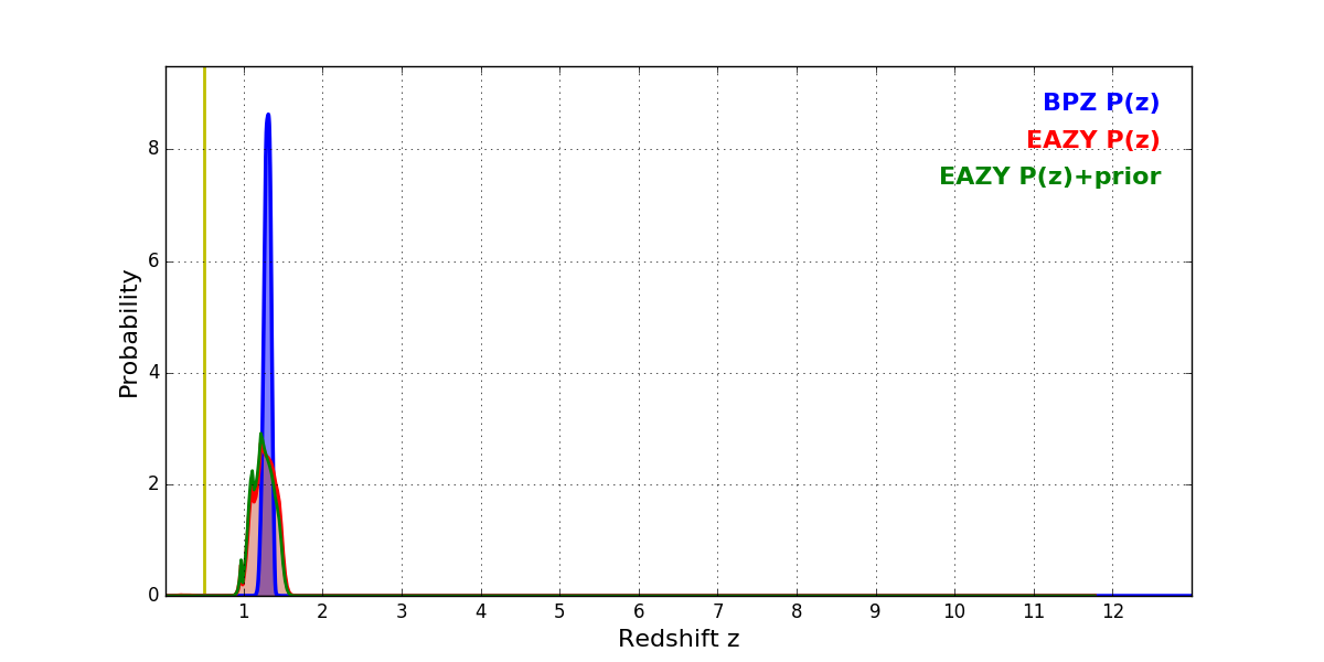 In P(z) plots: Yellow lines mark the cluster redshift z = 0.505,