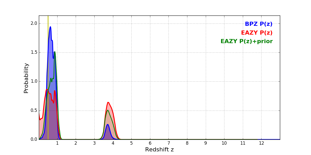 In P(z) plots: Yellow lines mark the cluster redshift z = 0.505,