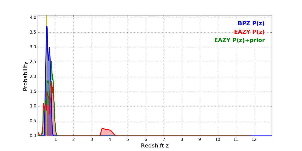 In P(z) plots: Yellow lines mark the cluster redshift z = 0.505,